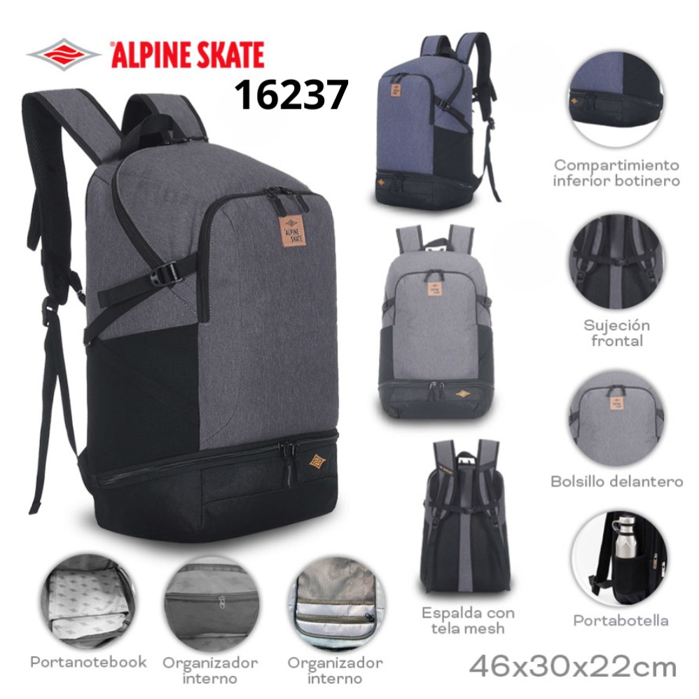 Mochila PortaNtbk Alpine Skate 16237: Info: portanotebook, bolsillo frontal, portabotella, compartimiento inferior tipo botinero. Composición: cordura jaspeada+nylon. Alto: 47cm. Ancho: 30cm. Profundidad: 22cm