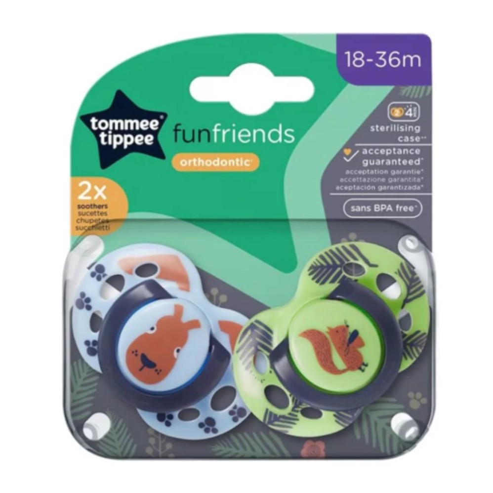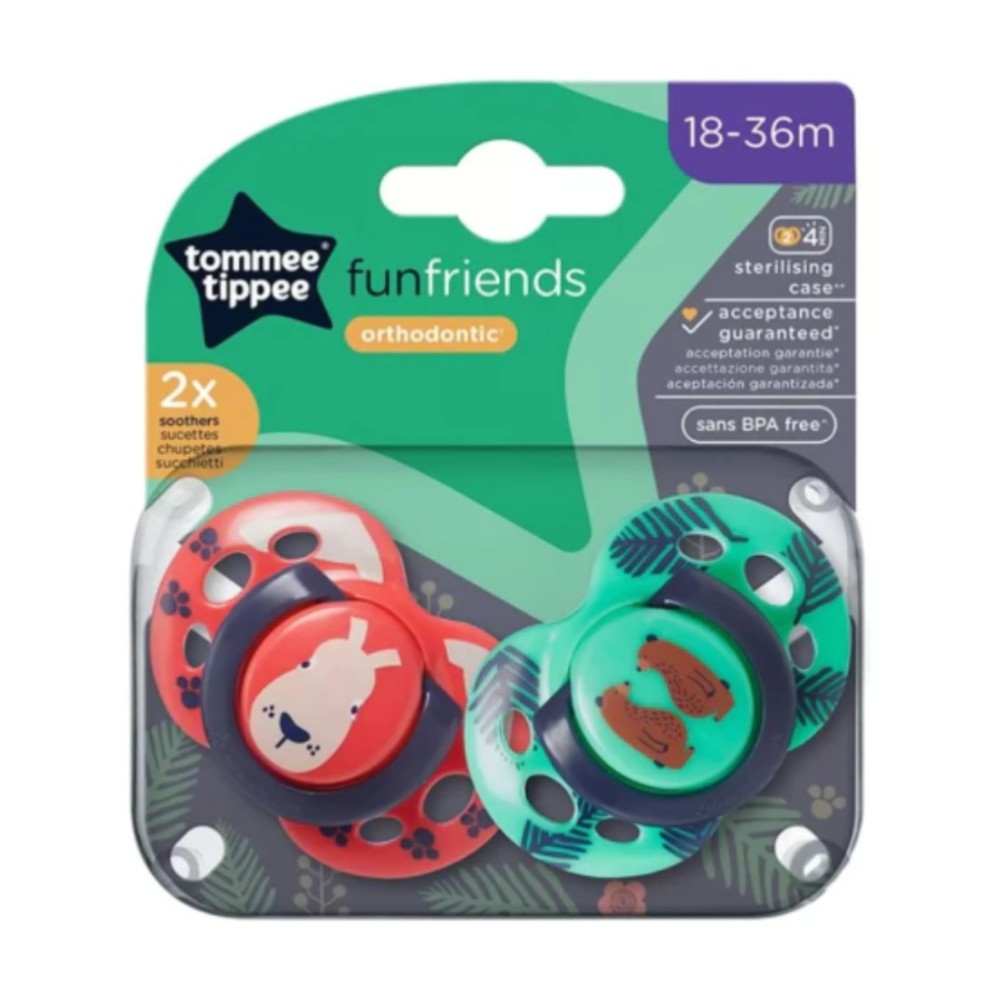 Tommee Tippee ha desarrollado una nueva gama de chupetes aprobados por bebés. La tetina ortodóntica simétrica ha sido diseñada especialmente para ayudar a optimizar la aceptación del bebé y, en pruebas independientes, la mayoría los ha aceptado desde el primer uso. La tetina en forma de ortodoncia simétrica ha sido diseñada para mejorar el equilibrio, lo que facilita que los bebés sostengan el chupete en la boca y apoyen el desarrollo oral natural. Escudo de estilo tradicional con diseños brillantes y juguetones. Los diseños se basan en un tema de la jungla que abarca desde lindas jirafas y pandas para bebés más pequeños hasta tigres y cebras brillantes para bebés mayores.