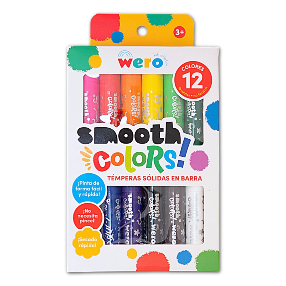 Tempera solida 12 colores. Lavables. No tóxicos. Colores Brillantes. No necesita pincel ni agua. Facil agarre para las manos pequeñas. Secado rapido. Recomendado a partir de 3 años. Tamaño de la caja: 15 cms x 25 cms aproximadamente.